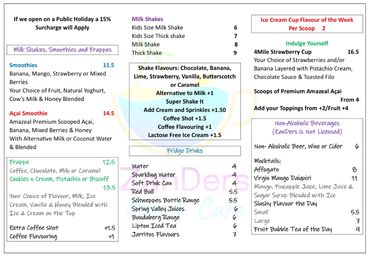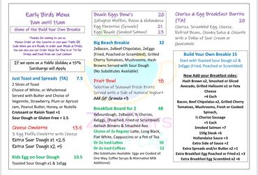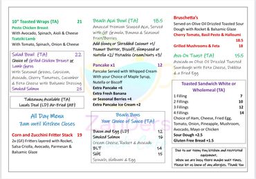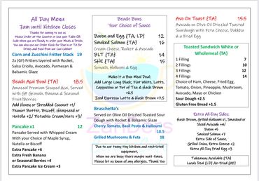 Bacon, Eggs, Pancakes, Iced Coffee, Eggs Bene, Burritos, Tacos, Nachos, Salads, Burgers, Wraps, Fritters, Toasted Sandwiches, Muffins, Sweet Treats, Milkshakes, Smoothies and a whole lot more.